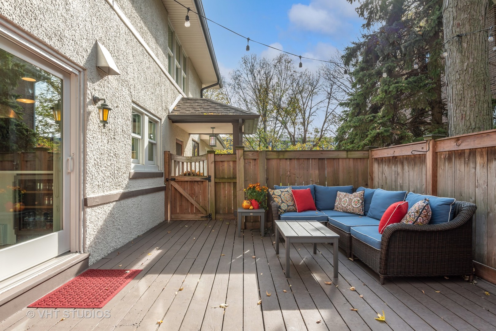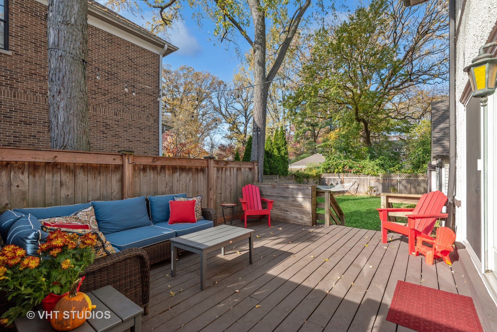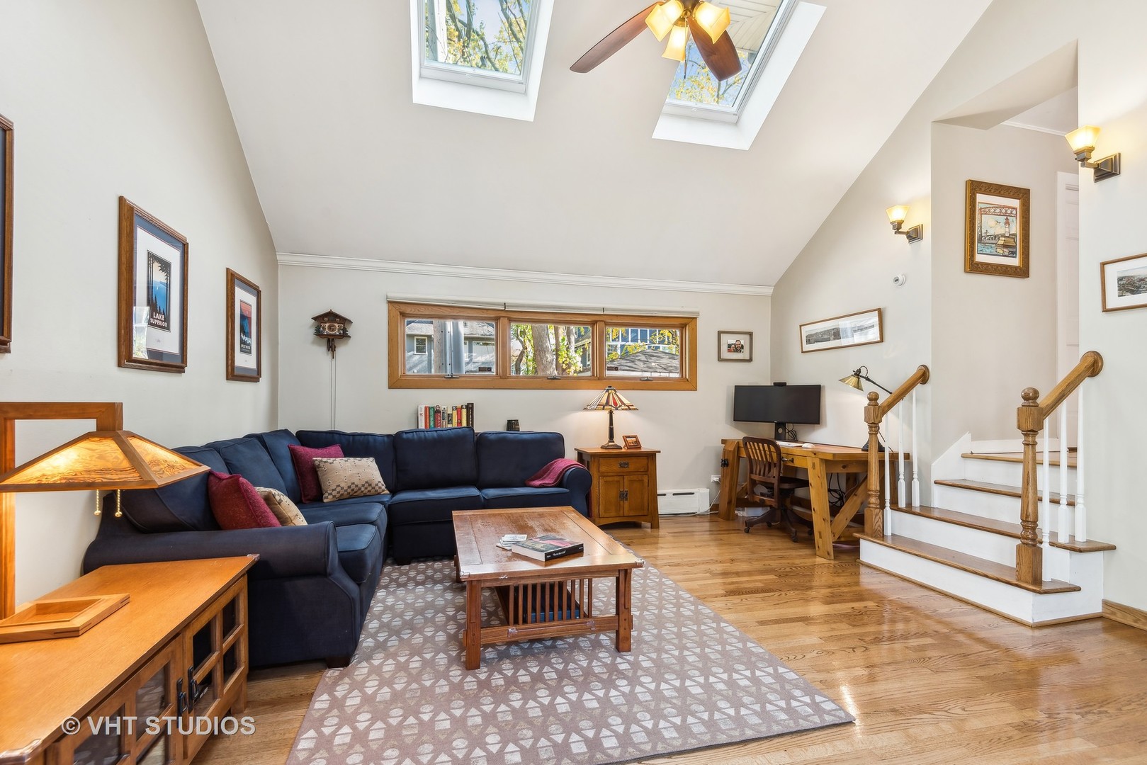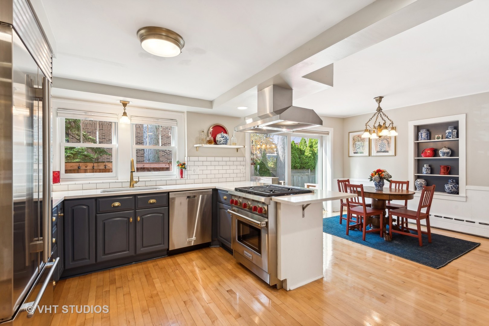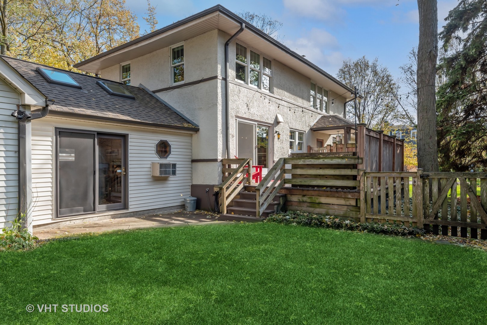Charming Prairie-Style Home in Immaculate Condition! Discover this beautifully updated Prairie-style residence nestled on a picturesque, tree-lined street in NW Evanston, ready for you to move right in! The spacious eat-in kitchen boasts high-end features, including a Sub Zero refrigerator, Wolf range/oven, stainless steel appliances, wine fridge, quartz countertops, and ample pantry storage. Enjoy seamless indoor-outdoor living with sliding doors that lead to a generous deck, perfect for grilling and entertaining. The first floor also features a formal dining room, a cozy living room with a gas burning fireplace, and an expansive family room adorned with skylights and vaulted ceilings. You'll also find a convenient powder room and a laundry room, making everyday living effortless. Upstairs, the large primary suite includes a private bathroom and a walk-in closet. Two additional well-sized bedrooms share a second full bath, ensuring plenty of space for family or guests. The basement offers abundant storage, while the attached 2-car garage and lovely fenced yard enhance the home's appeal. Recent upgrades include a newer roof and skylights, range, beverage fridge, chimney box and gas logs, washing machine, garage opener, and recently painted deck! Conveniently located to Central Street's shops, restaurants, and Metra, this well-maintained home is the perfect place to embrace your new lifestyle. Don't miss out on this opportunity-love where you live!