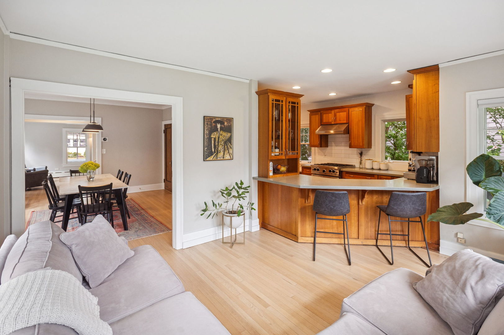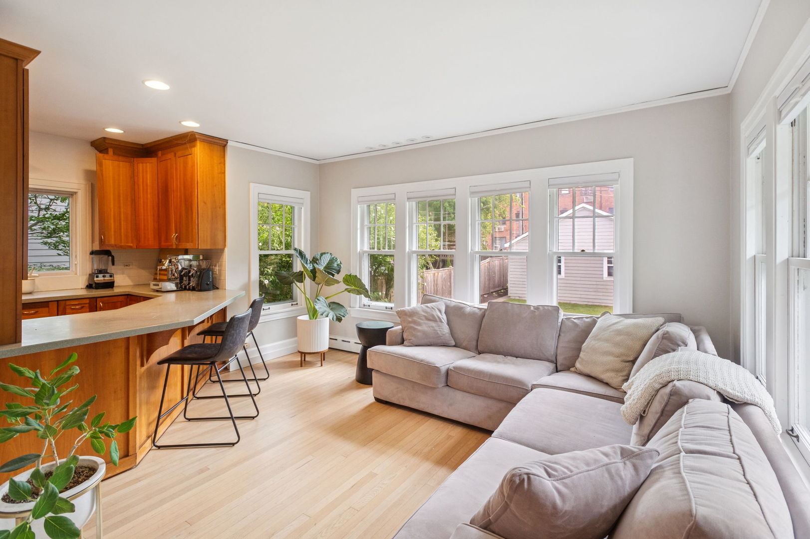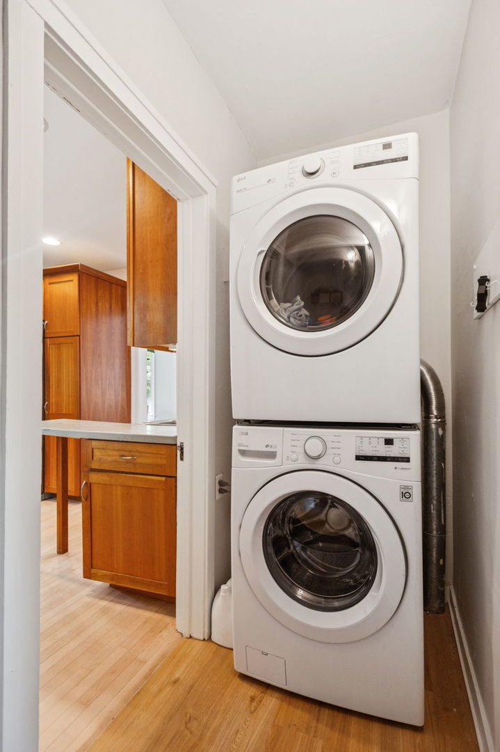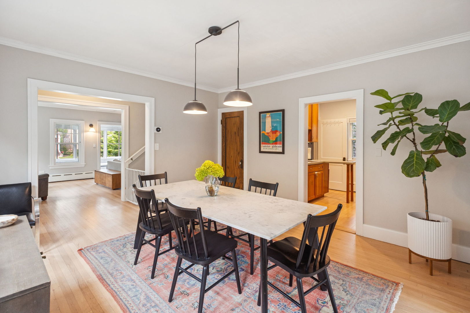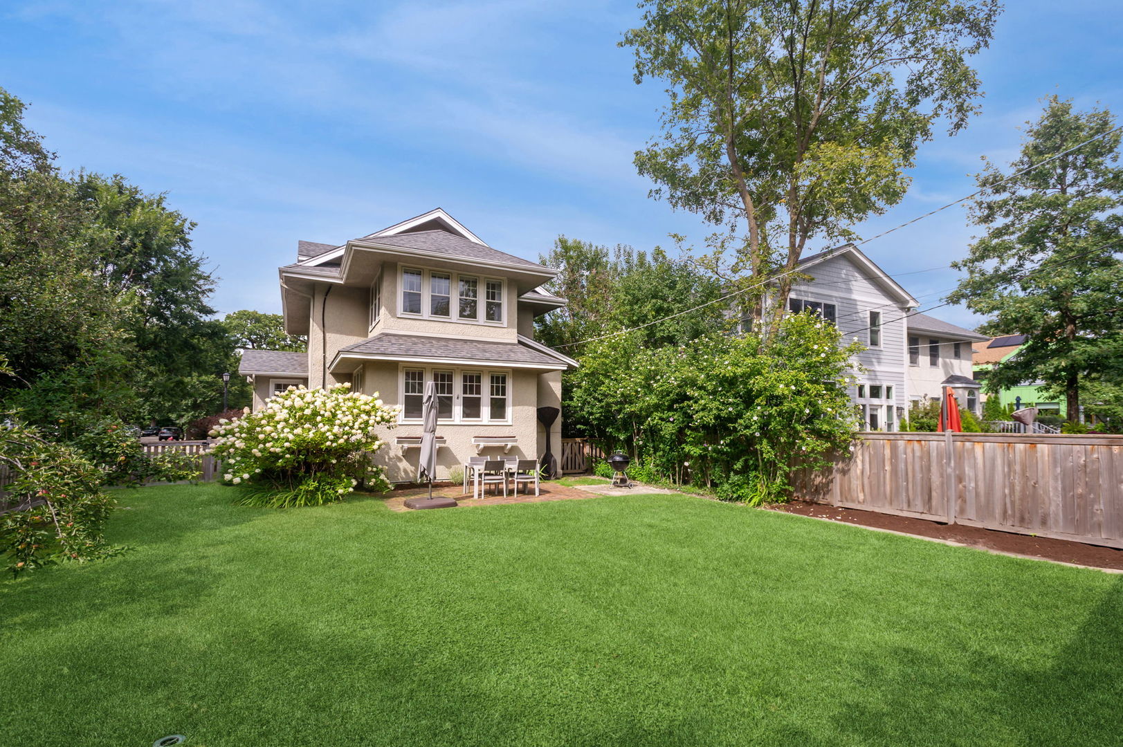 Beautiful home situated on a corner lot in NW Evanston allowing streaming sunlight from all sides! Large living room with oversized windows, fireplace and adjacent screened porch for enjoyment much of the year. Updated kitchen with new appliances (2017-18), breakfast bar and views of back yard from versatile dining room/family room/breakfast room space. Second floor with 3 bedrooms plus a tandem bedroom. Large second floor bathroom renovated in 2017. Stairs to unfinished 3rd floor with endless potential! FInished basement includes: waterproofing, recreation room, large bathroom with steam shower. Lovely yard with patio, perennial landscaping and newer garage (2017). New roof (2017), new triple track storms and screens (2020). Easy walk to Central Street shops, Metra, parks and more!