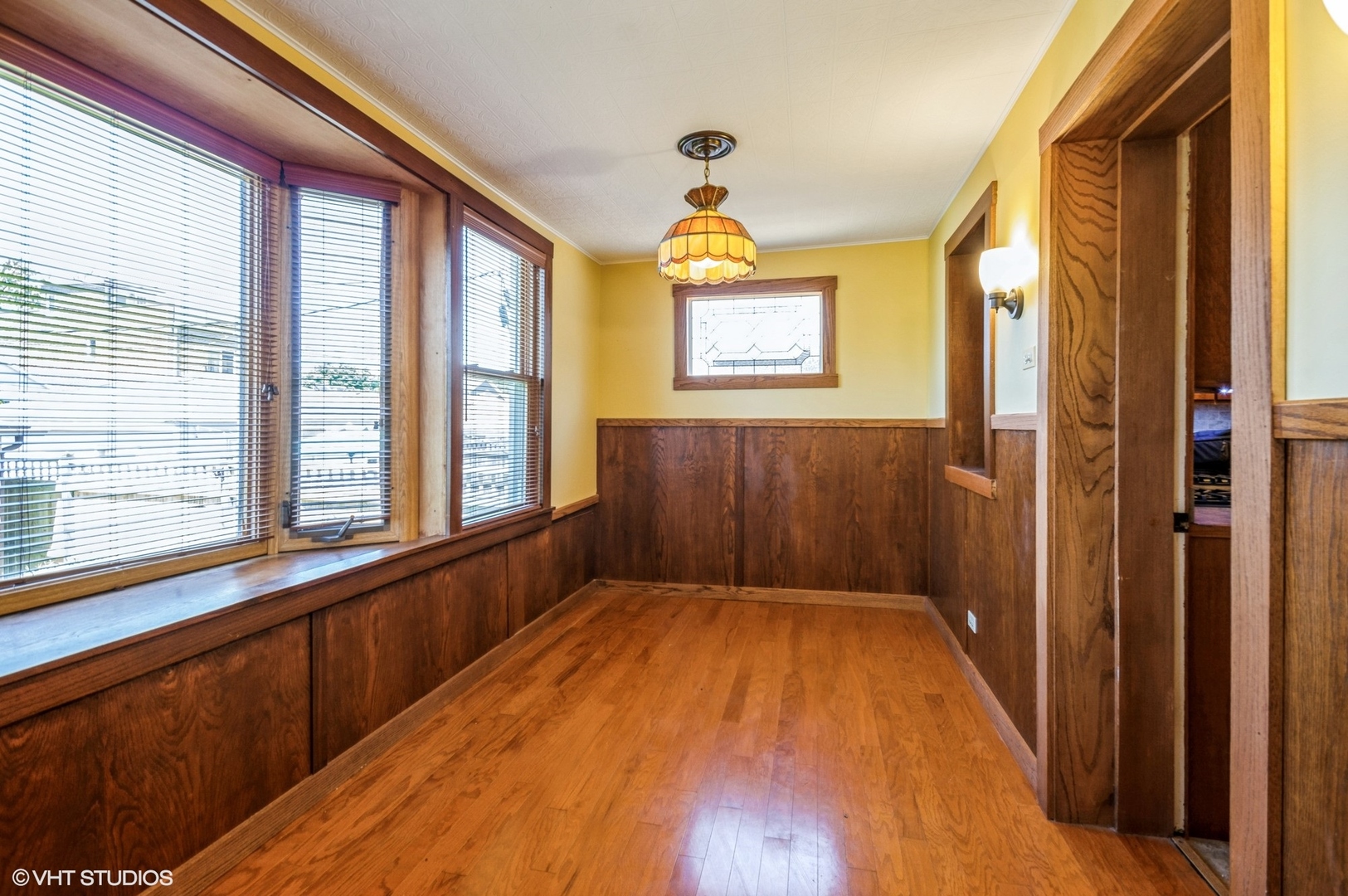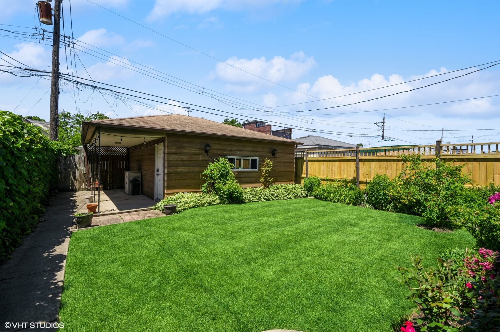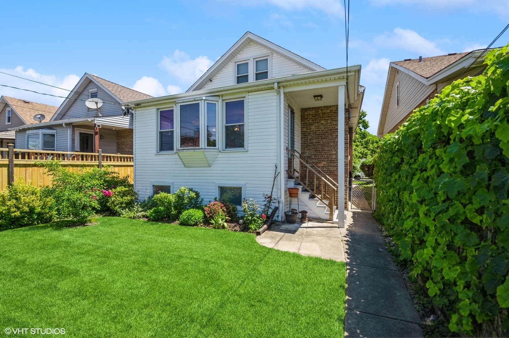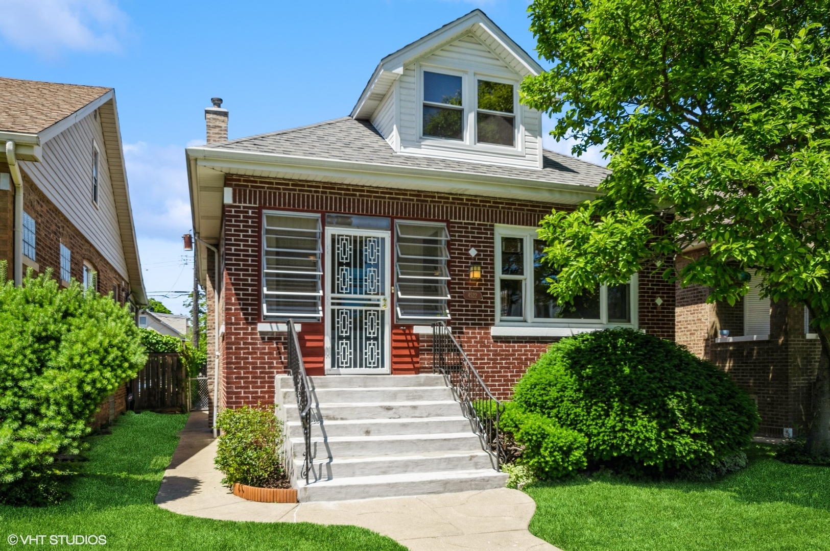 Portage Park Classic Chicago brick bungalow. 1 block to beautiful Dunham Park. Original natural woodwork and hardwood floors on main floor - living room, formal dining room, 2 bedrooms, full bath. Updated kitchen with wood cabinets, stainless appliances: 3 yr new refrigerator, newer microwave, gas stove, Bosch dishwasher, & ceramic tile backsplash. Light-filled 3 season room. 2nd floor features a large bedroom, half bath, open area with lots of built-in drawers and storage. Hot water baseboard heat. 3 AC units included. Updated circuit breaker electric panel. Rec room in basement with new floor, full bath, work room,(workbench stays) laundry/utility room. Beautifully landscaped yard with privacy fence. (Wooden fence on north side is brand new) 2 car garage with side patio. Nearby Dunham Park offers baseball diamonds, playground, park field house, activities, and tennis courts. Home has been well-cared for by long-time owners, but being sold in 'As Is' condition.