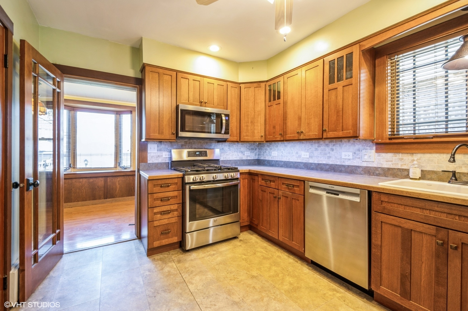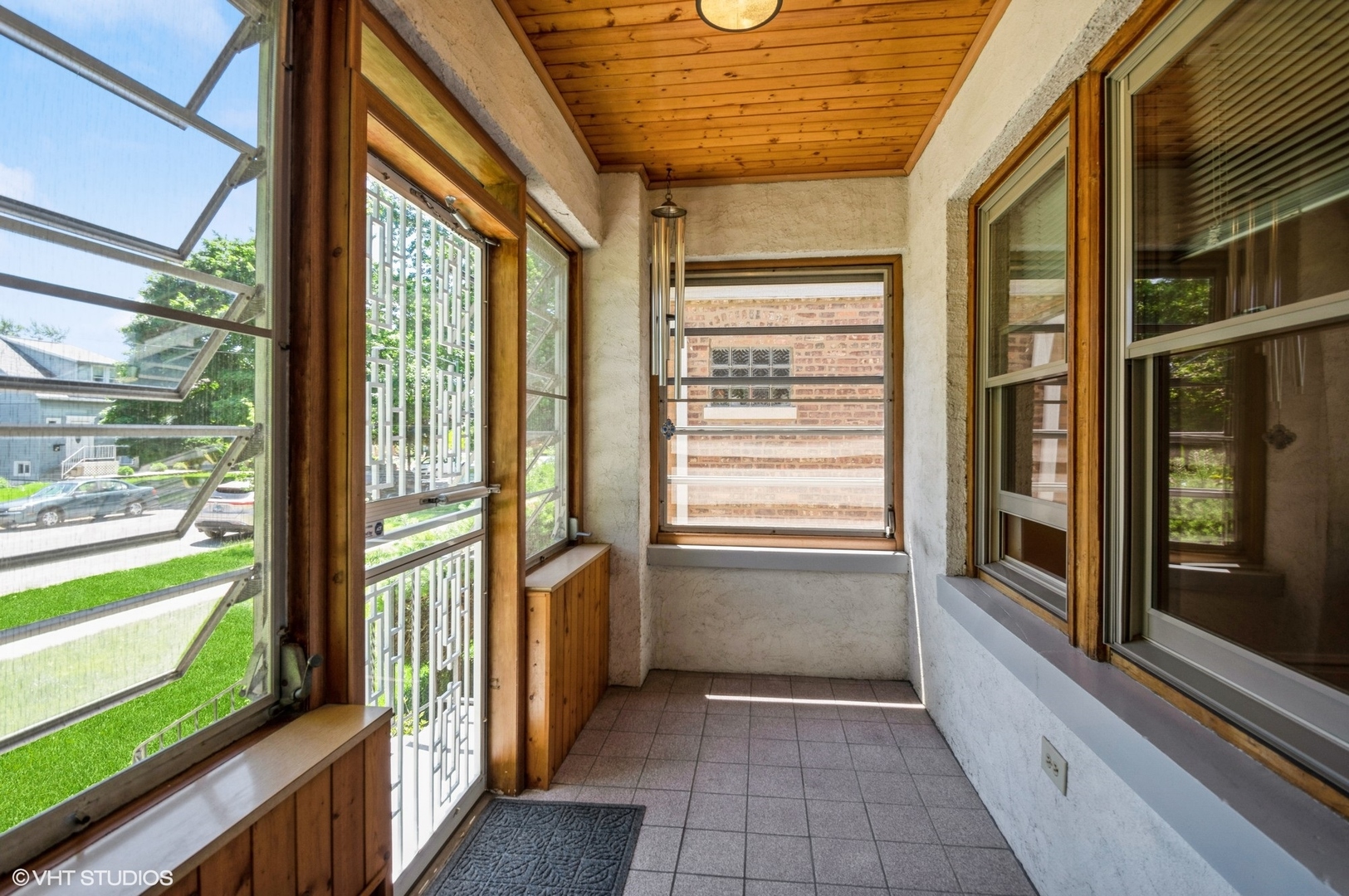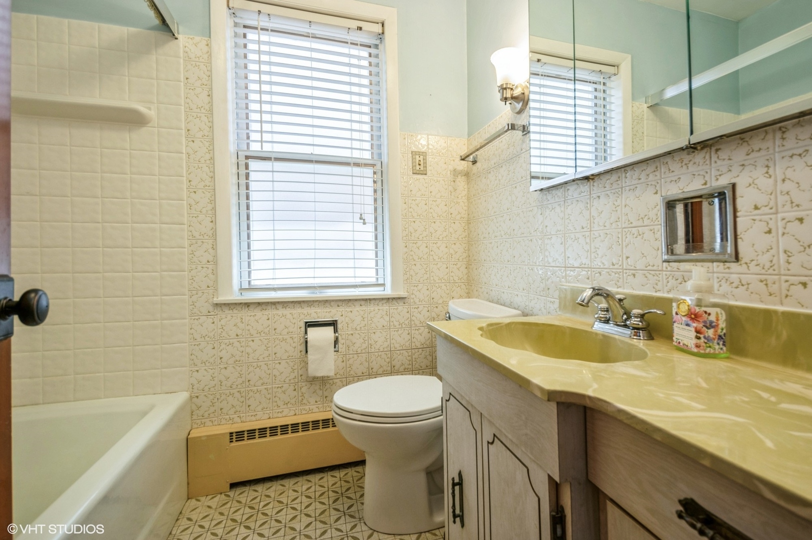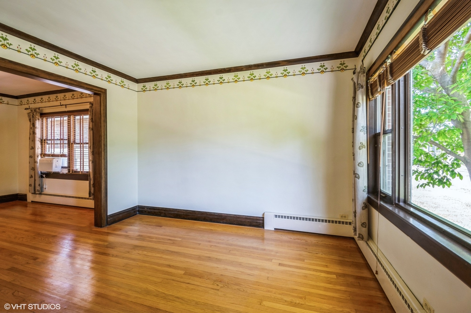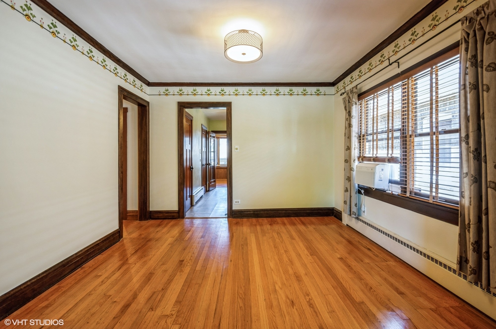 Portage Park Classic Chicago brick bungalow. 1 block to beautiful Dunham Park. Original natural woodwork and hardwood floors on main floor - living room, formal dining room, 2 bedrooms, full bath. Updated kitchen with wood cabinets, stainless appliances: 3 yr new refrigerator, newer microwave, gas stove, Bosch dishwasher, & ceramic tile backsplash. Light-filled 3 season room. 2nd floor features a large bedroom, half bath, open area with lots of built-in drawers and storage. Hot water baseboard heat. 3 AC units included. Updated circuit breaker electric panel. Rec room in basement with new floor, full bath, work room,(workbench stays) laundry/utility room. Beautifully landscaped yard with privacy fence. (Wooden fence on north side is brand new) 2 car garage with side patio. Nearby Dunham Park offers baseball diamonds, playground, park field house, activities, and tennis courts. Home has been well-cared for by long-time owners, but being sold in 'As Is' condition.