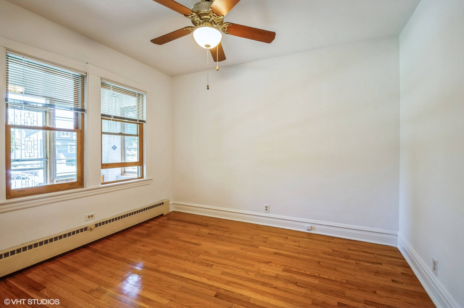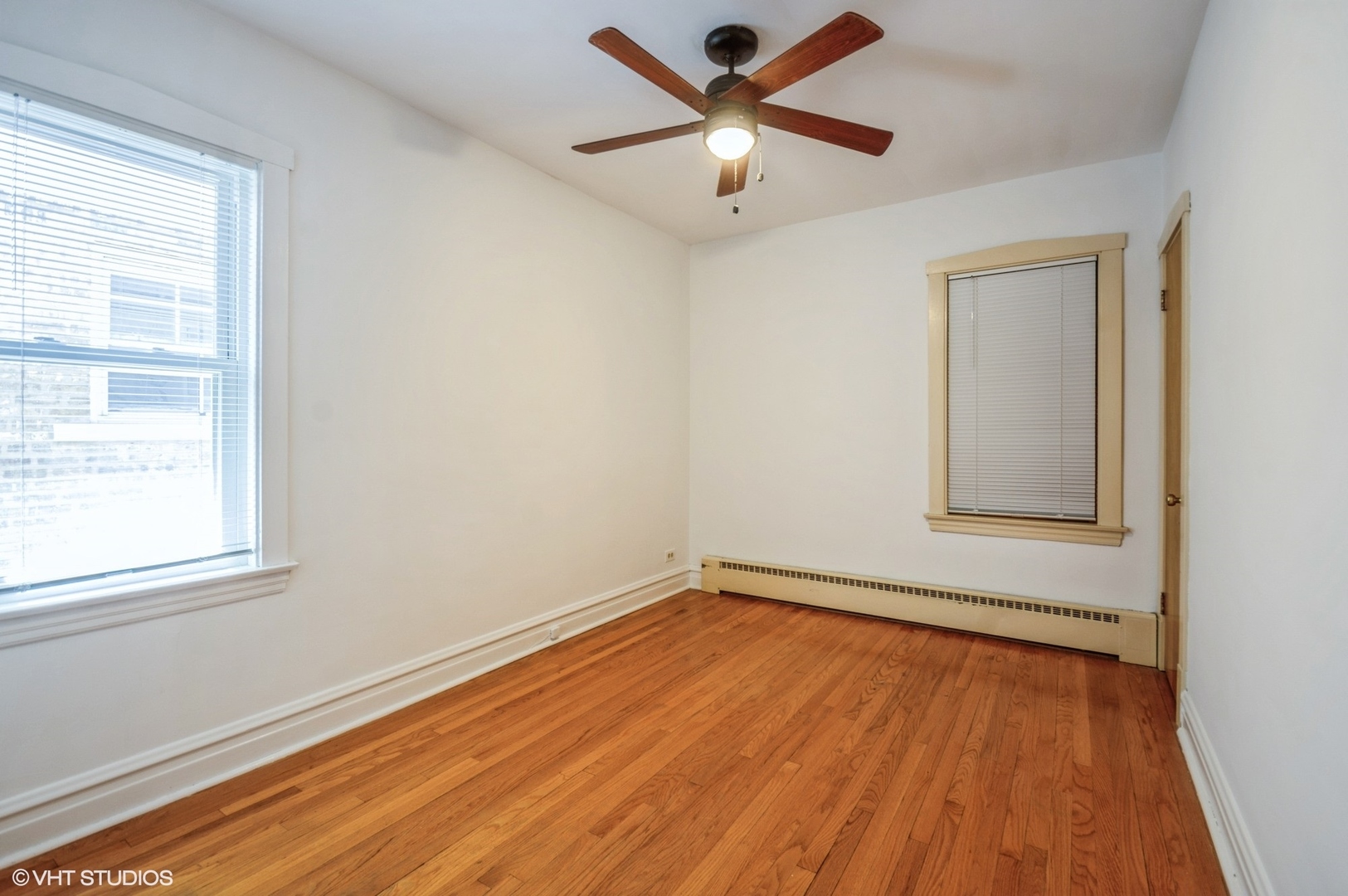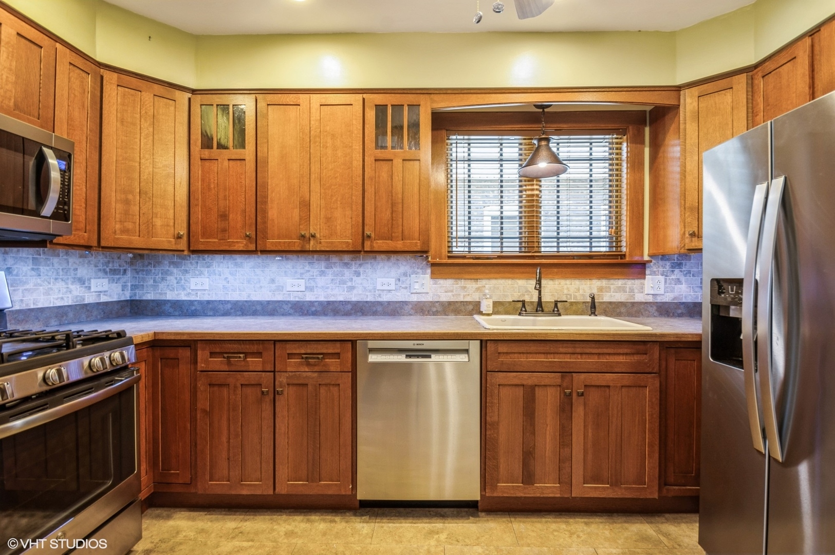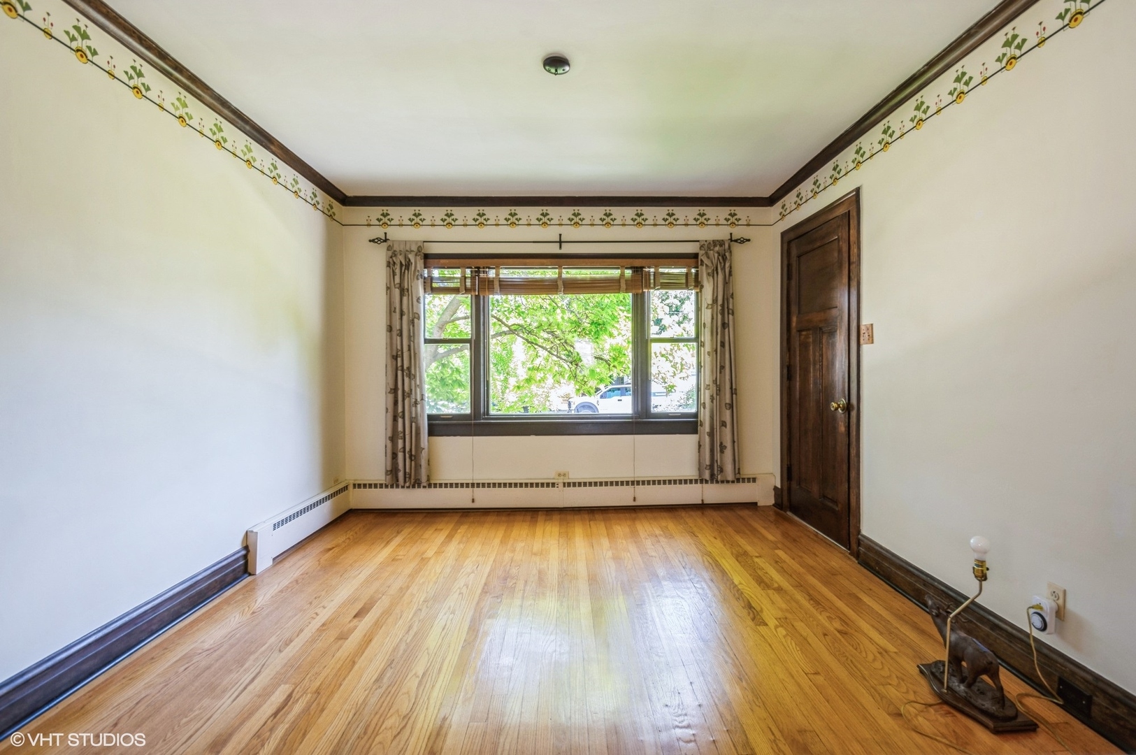 Portage Park Classic Chicago brick bungalow. 1 block to beautiful Dunham Park. Original natural woodwork and hardwood floors on main floor - living room, formal dining room, 2 bedrooms, full bath. Updated kitchen with wood cabinets, stainless appliances: 3 yr new refrigerator, newer microwave, gas stove, Bosch dishwasher, & ceramic tile backsplash. Light-filled 3 season room. 2nd floor features a large bedroom, half bath, open area with lots of built-in drawers and storage. Hot water baseboard heat. 3 AC units included. Updated circuit breaker electric panel. Rec room in basement with new floor, full bath, work room,(workbench stays) laundry/utility room. Beautifully landscaped yard with privacy fence. (Wooden fence on north side is brand new) 2 car garage with side patio. Nearby Dunham Park offers baseball diamonds, playground, park field house, activities, and tennis courts. Home has been well-cared for by long-time owners, but being sold in 'As Is' condition.