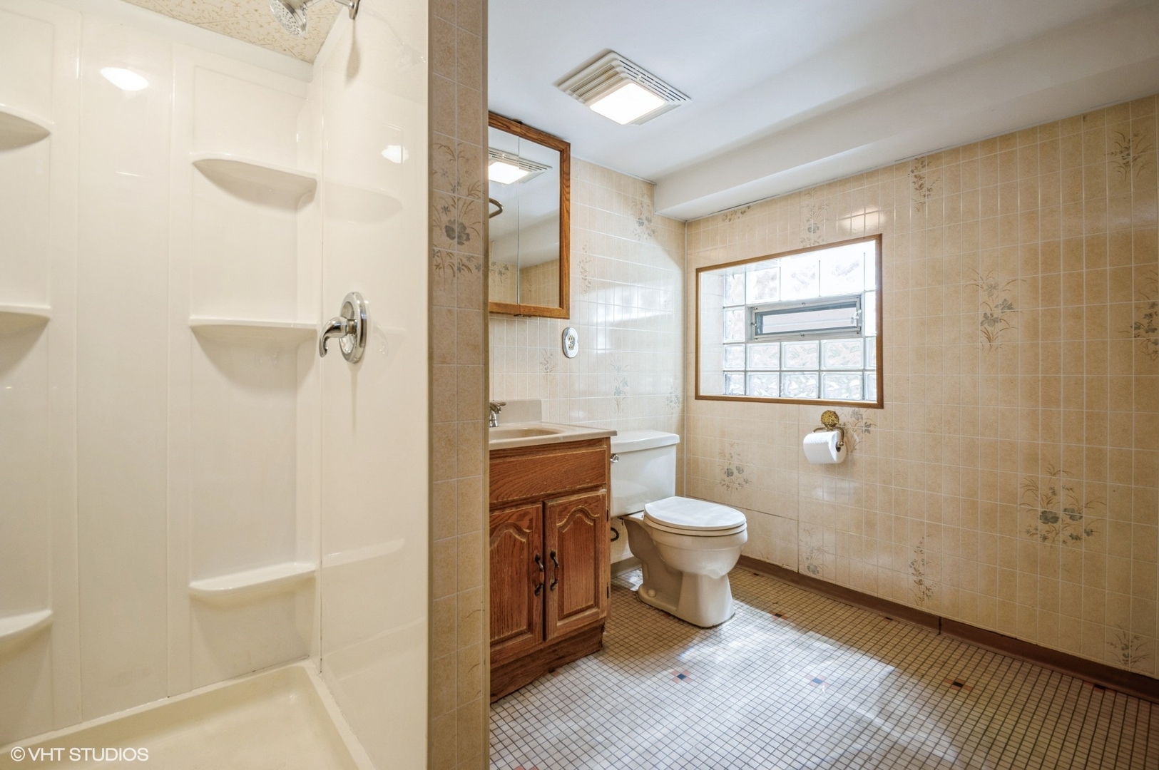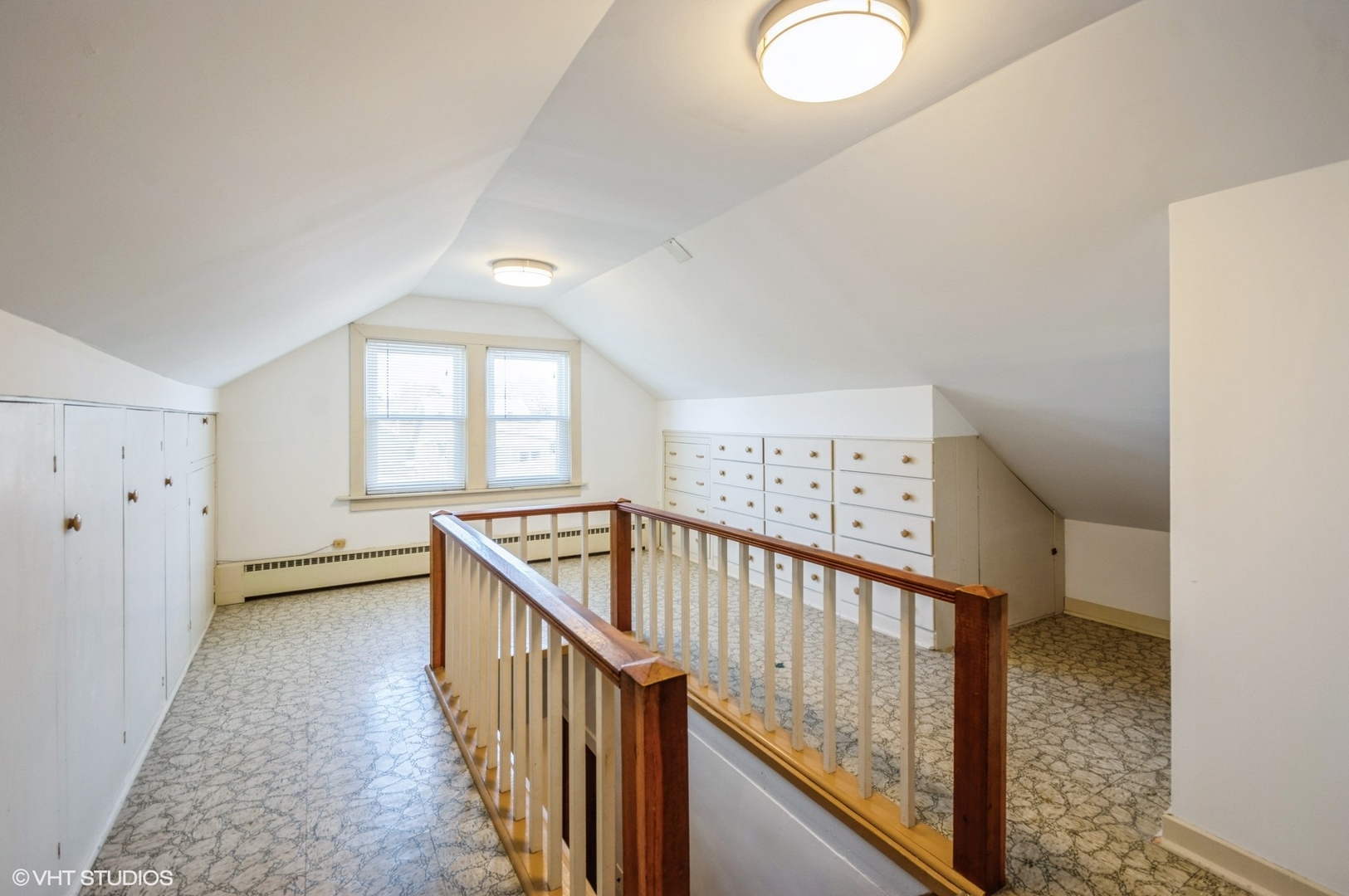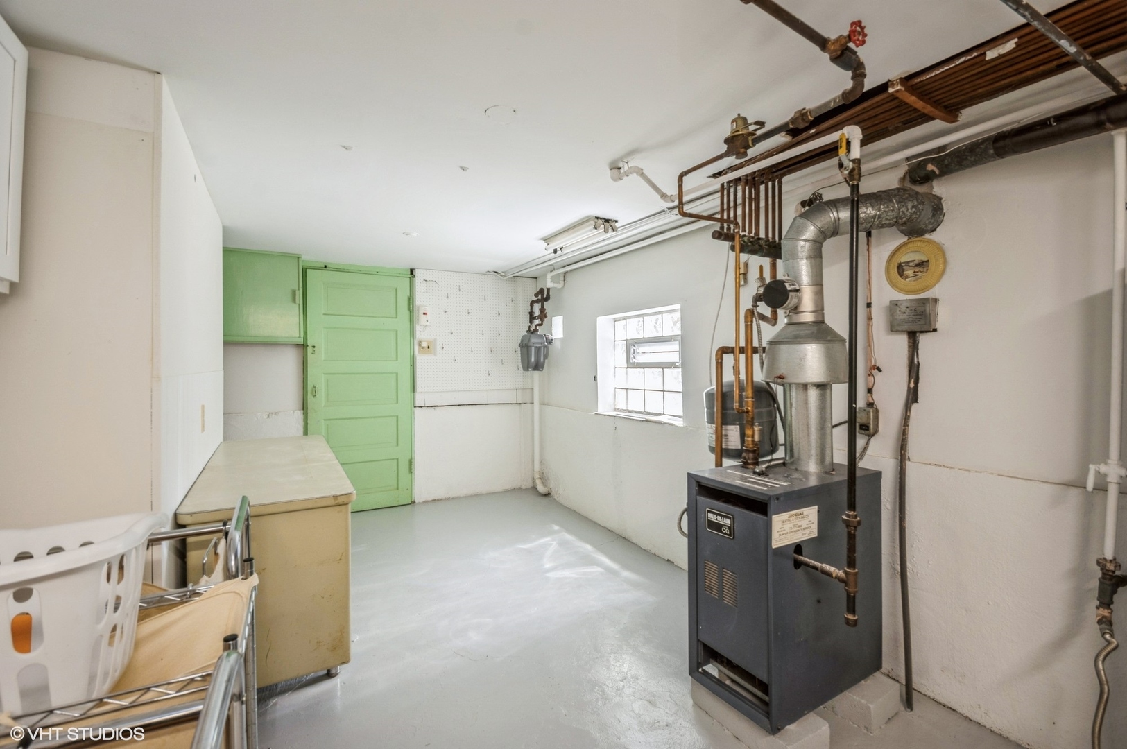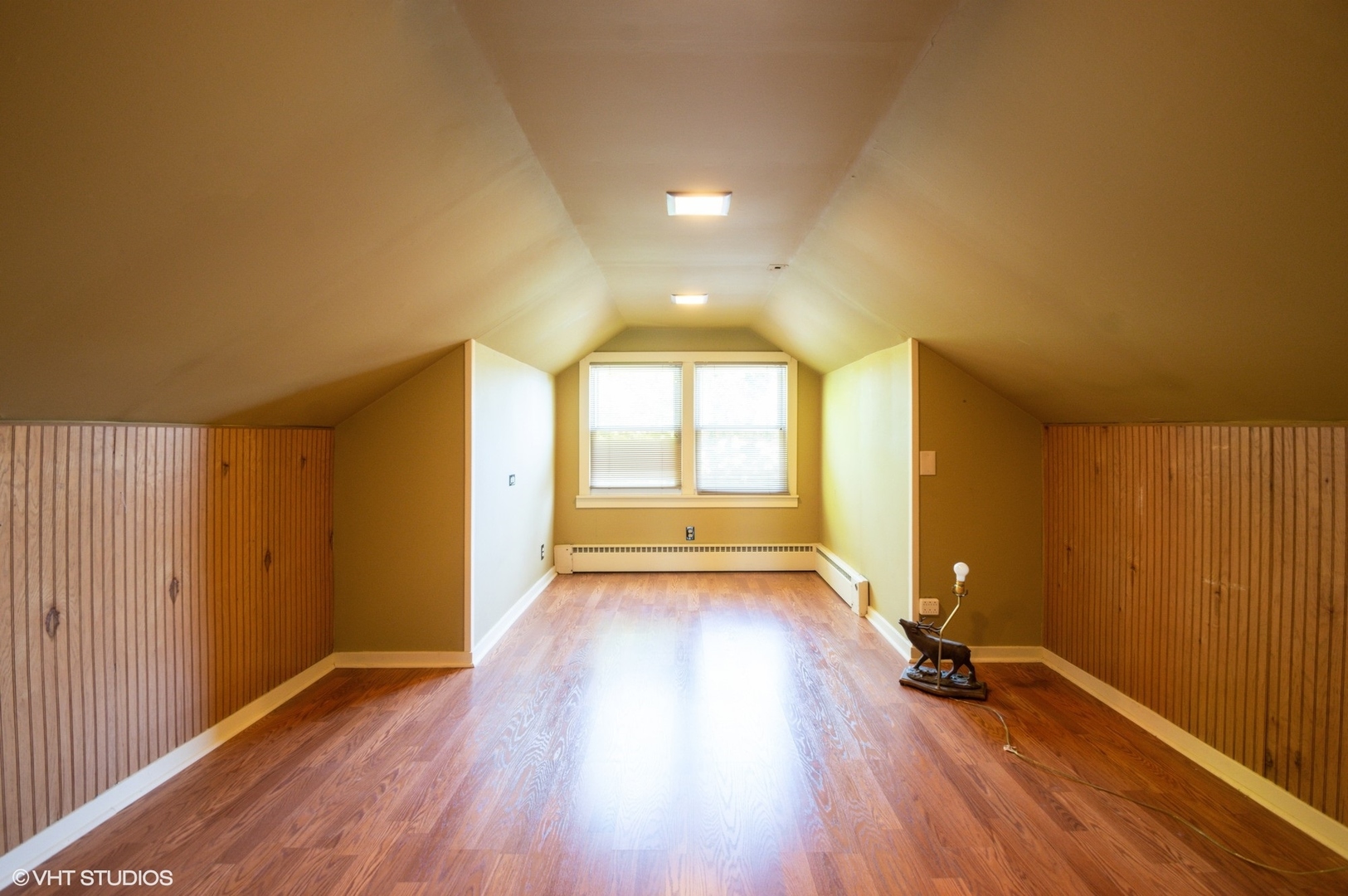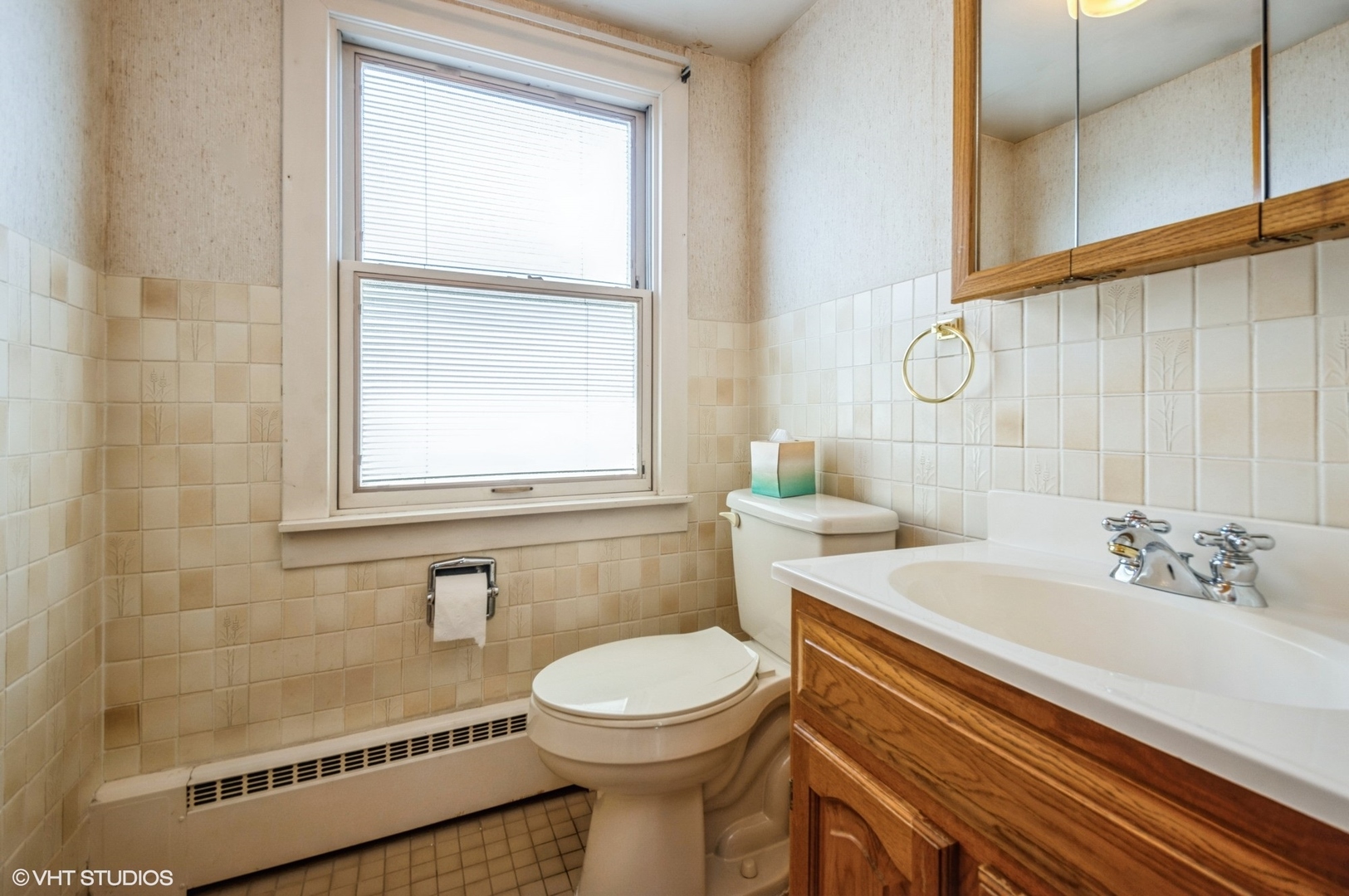 Portage Park Classic Chicago brick bungalow. 1 block to beautiful Dunham Park. Original natural woodwork and hardwood floors on main floor - living room, formal dining room, 2 bedrooms, full bath. Updated kitchen with wood cabinets, stainless appliances: 3 yr new refrigerator, newer microwave, gas stove, Bosch dishwasher, & ceramic tile backsplash. Light-filled 3 season room. 2nd floor features a large bedroom, half bath, open area with lots of built-in drawers and storage. Hot water baseboard heat. 3 AC units included. Updated circuit breaker electric panel. Rec room in basement with new floor, full bath, work room,(workbench stays) laundry/utility room. Beautifully landscaped yard with privacy fence. (Wooden fence on north side is brand new) 2 car garage with side patio. Nearby Dunham Park offers baseball diamonds, playground, park field house, activities, and tennis courts. Home has been well-cared for by long-time owners, but being sold in 'As Is' condition.