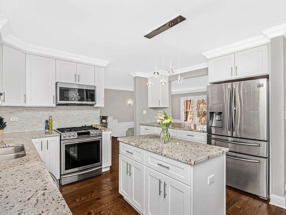 Gorgeous 4 bedroom 2.5 bathroom tri-level home completely renovated and redesigned with open concept floor plan in 2018. House has timeless picture chair rail, crown molding and baseboards and walnut hardwood floors throughout. Fabulous kitchen with granite counter tops and center island, stainless steel appliances, glass tile backsplash and charming breakfast area! 1st floor offers step- down living room with wood burning fireplace. Second floor includes 3 bedrooms & full bathroom with custom double vanity, granite counter tops and spacious tub.Lower level family room, 4th bedroom and full bath. Huge fantastic fenced backyard with 25X20 custom patio. Tons of recent updates include attached garage with new epoxy floor, newly paved driveway, all new windows, all new plumbing, new copper and PVC pipes, new vents and drains, new electrical panel and electric wiring, water heater 2018, new heating cables on the roof and gutters. Move in ready!